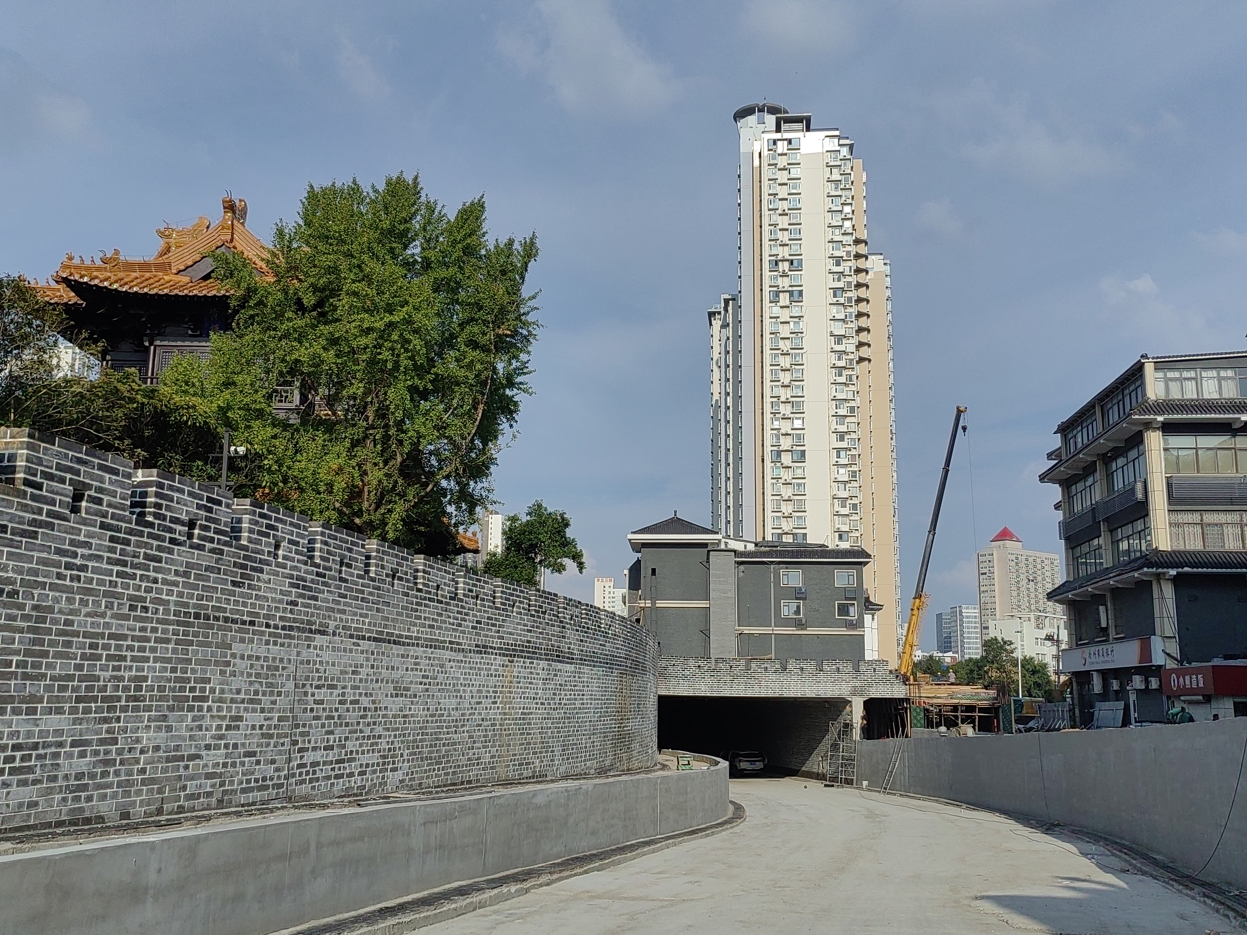 该工程道路全长410米,宽13.5米,箱涵隧道长68米,上盖面积3700平方米,工程造价3544万元,主要施工内容有箱涵、仿古砌筑、广场扩建、道路、交通工程、绿化、路灯、人行道铺装等。