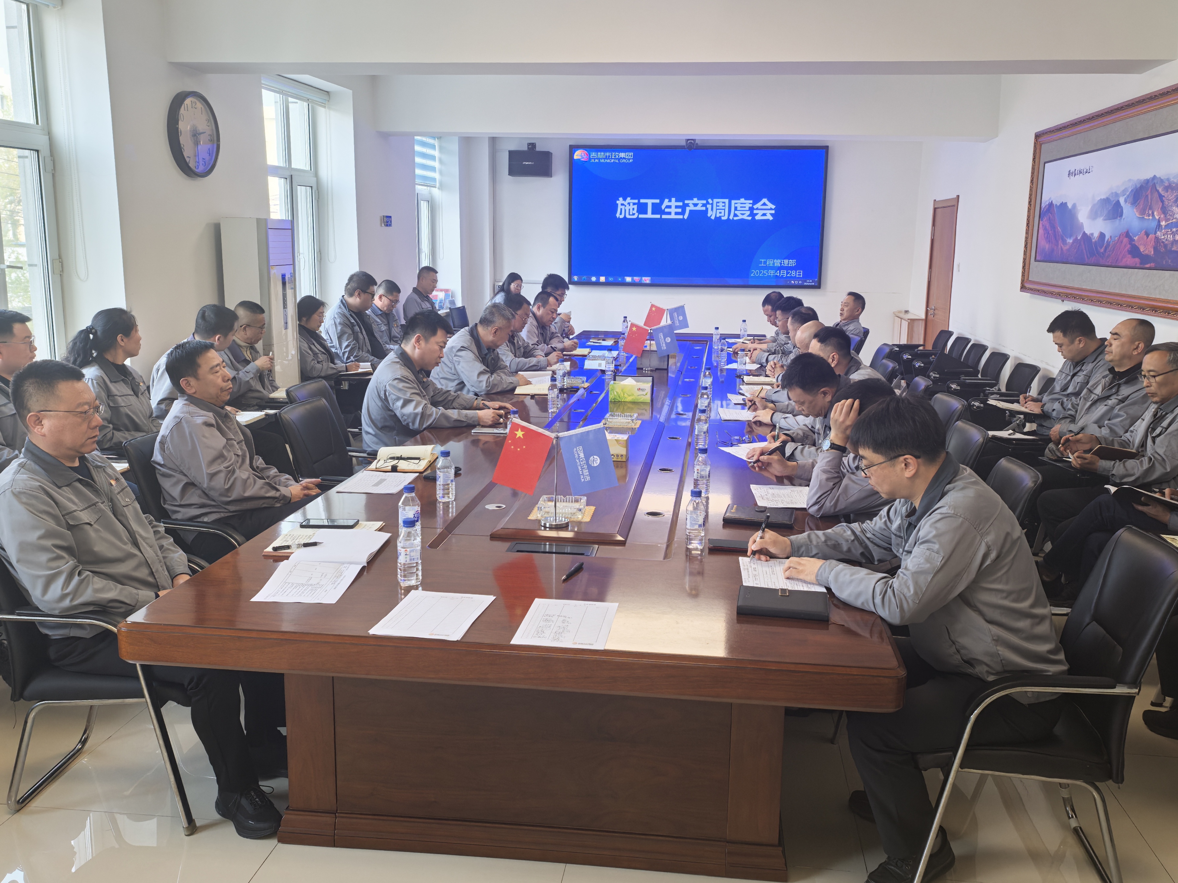 2025年4月28日下午,集团公司在三楼会议室召开了年度首次施工生产调度会。集团公司董事长窦哲华、总经理闫海旭等领导班子,基层单位经理、生产副经理、直属项目部经理,及机关部室负责人参加会议,副总经理谢永生主持会议。