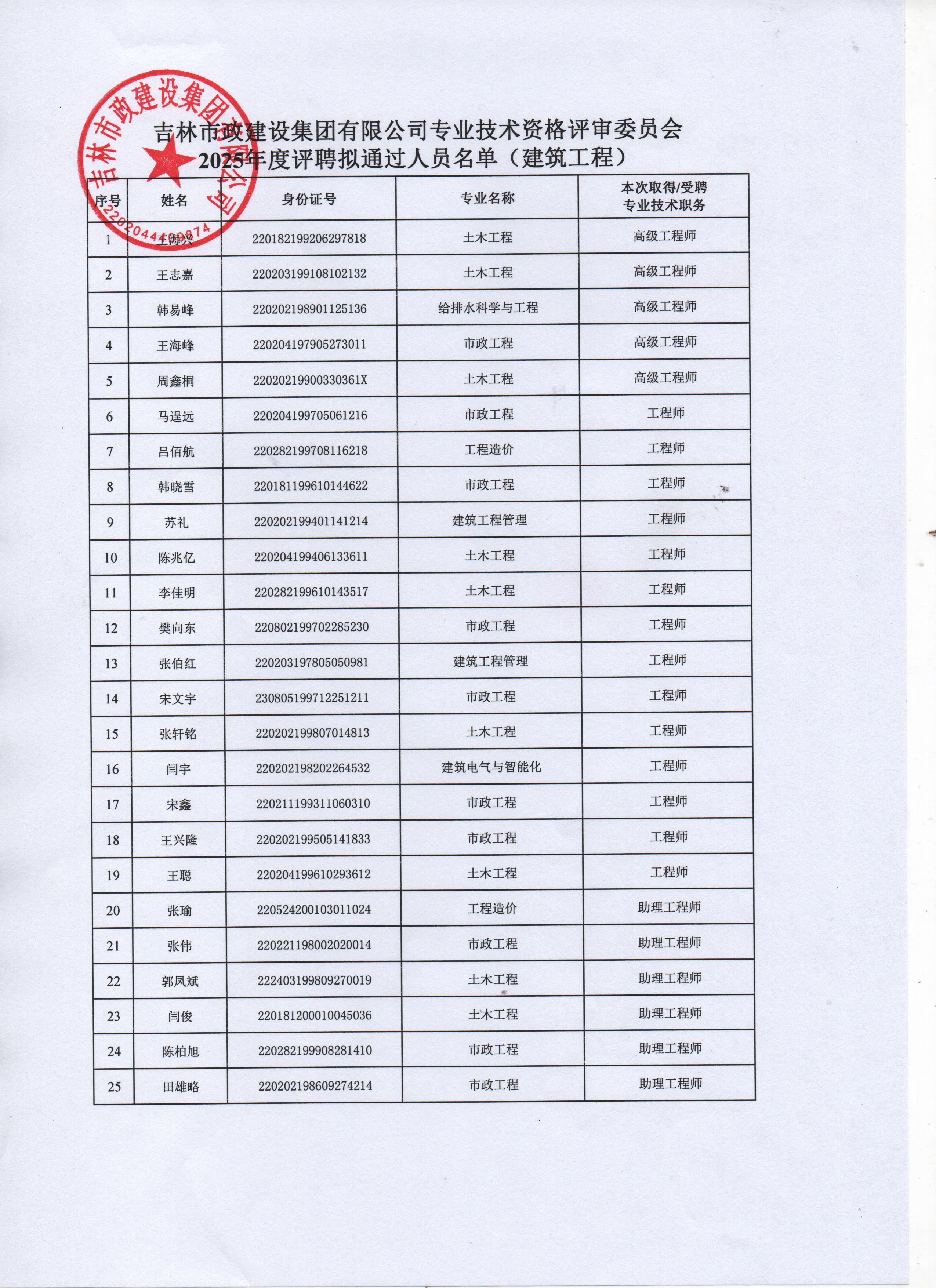 关于2025年建筑工程与交通工程专业专业技术职务评聘拟通过人员名单的公示