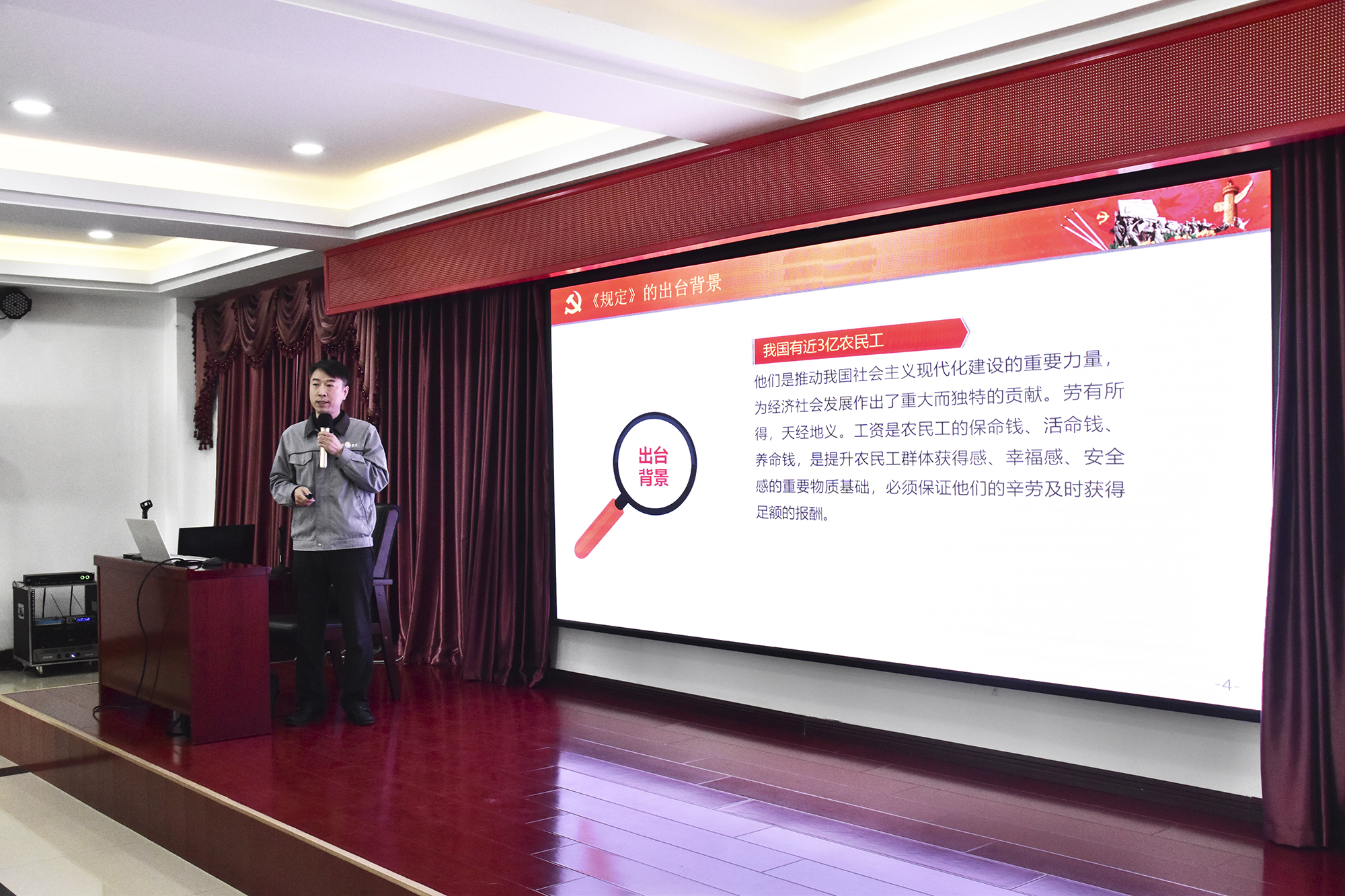 根据相关政策法规要求,结合公司实际,李广朋主要从《工程建设领域农民工工资保证金规定》出台的背景、逐章重点解读、重点关注内容以及重点内容回顾四个方面进行了深入浅出的讲解。