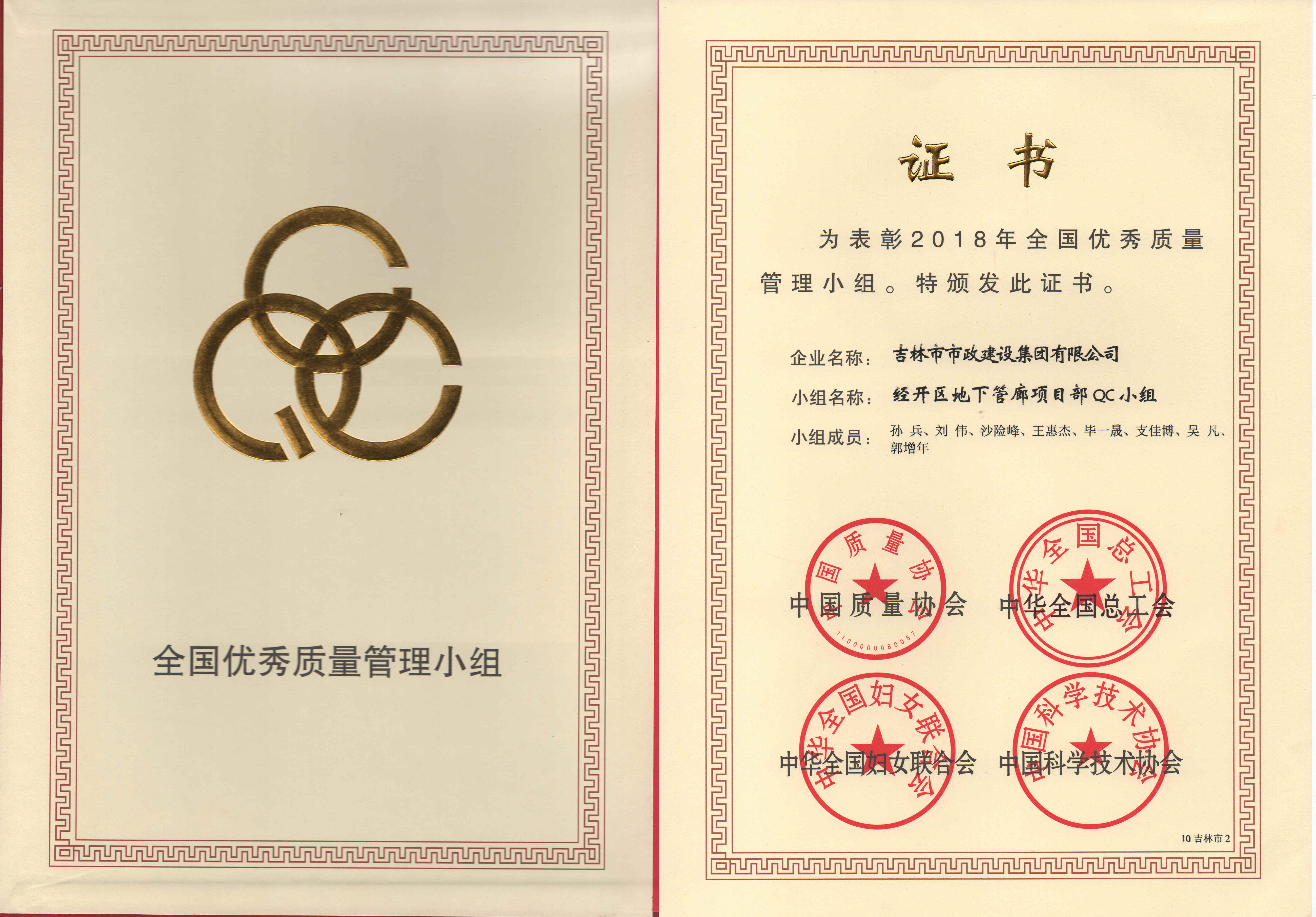2018年全国优秀质量管理小组--经开区地下管廊项目部QC小组