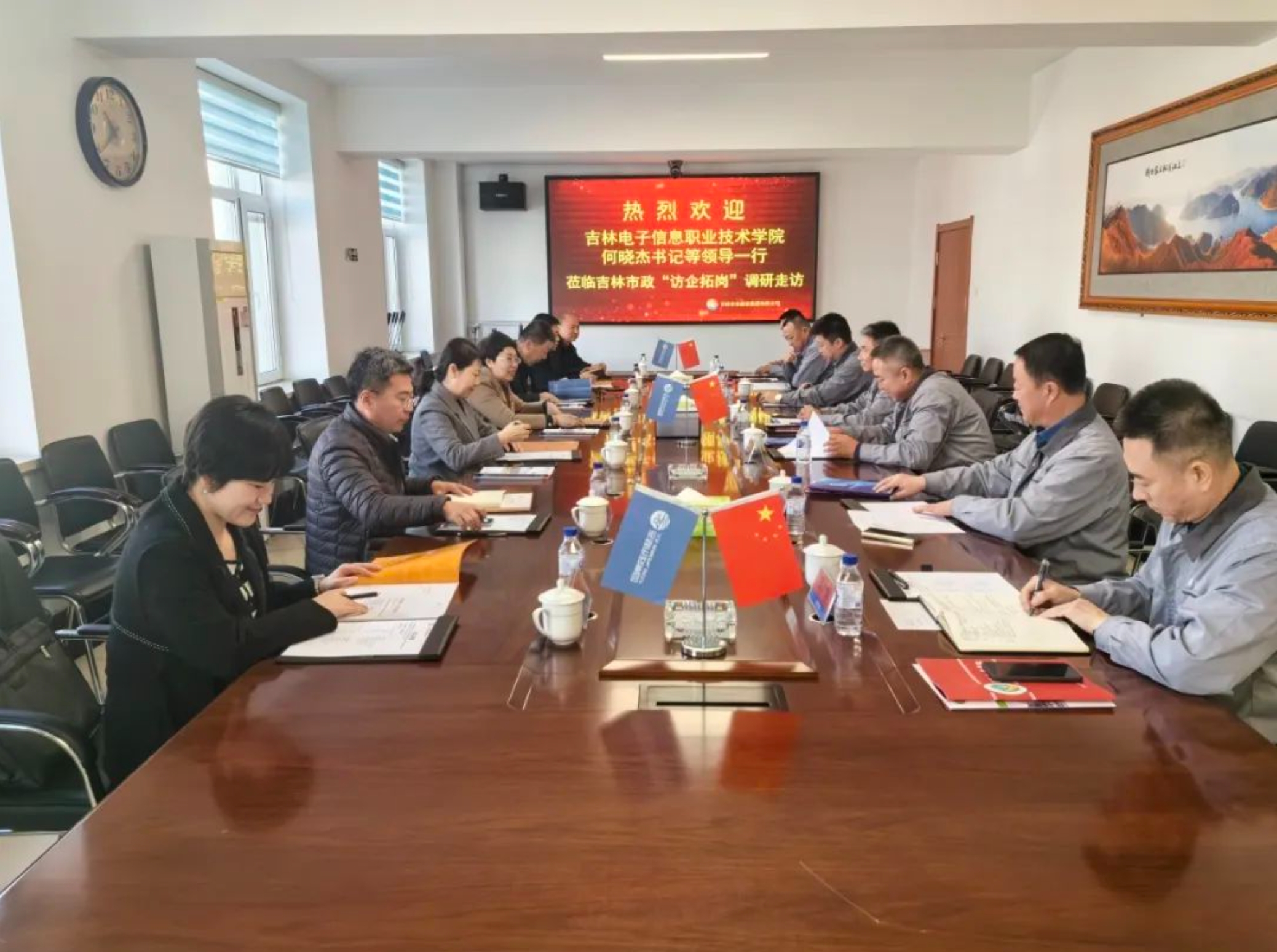 为深化校企合作交流,充分发挥校园人才优势,努力为企业发展提供技术、人才等方面支持,2024年3月18日,吉林电子信息职业技术学院何晓杰书记一行到吉林市政集团“访企拓岗”调研走访。吉林市政集团名誉董事长张成凯、董事长窦哲华、总经理闫海旭、副总经理谢永生、党委副书记代为等领导参加调研。